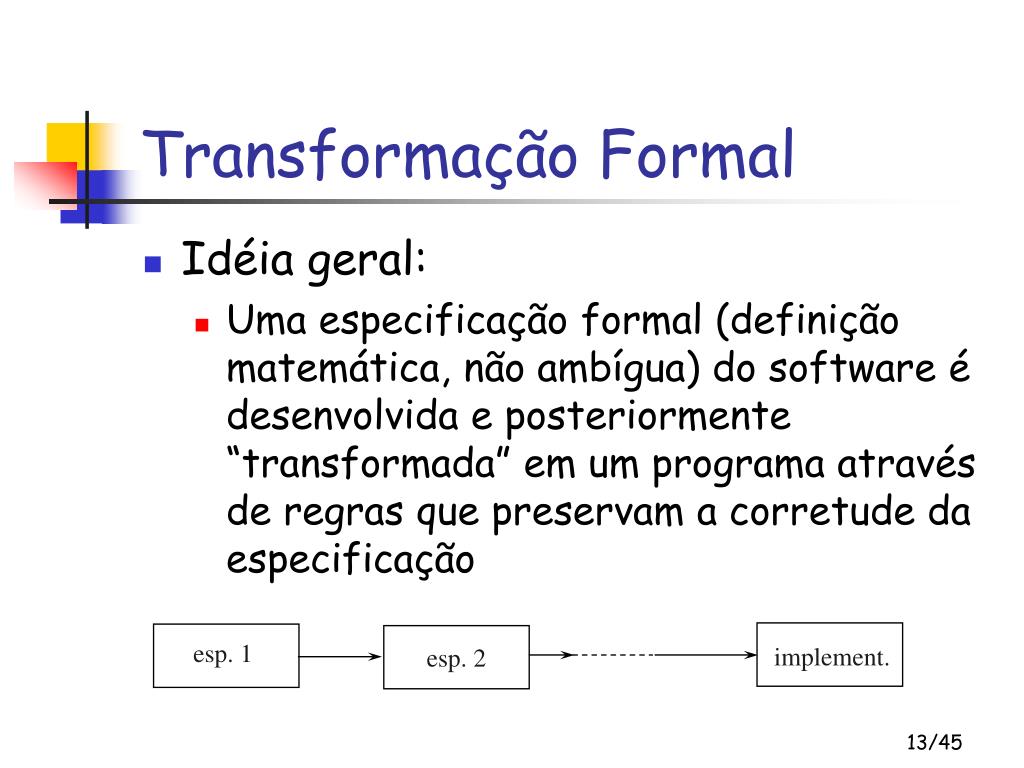 esp. 2 esp. 1 • implement. Transformação Formal • Idéia geral: • Uma especificação formal (definição matemática, não ambígua) do software é desenvolvida e posteriormente “transformada” em um programa através de regras que preservam a corretude da especificação
