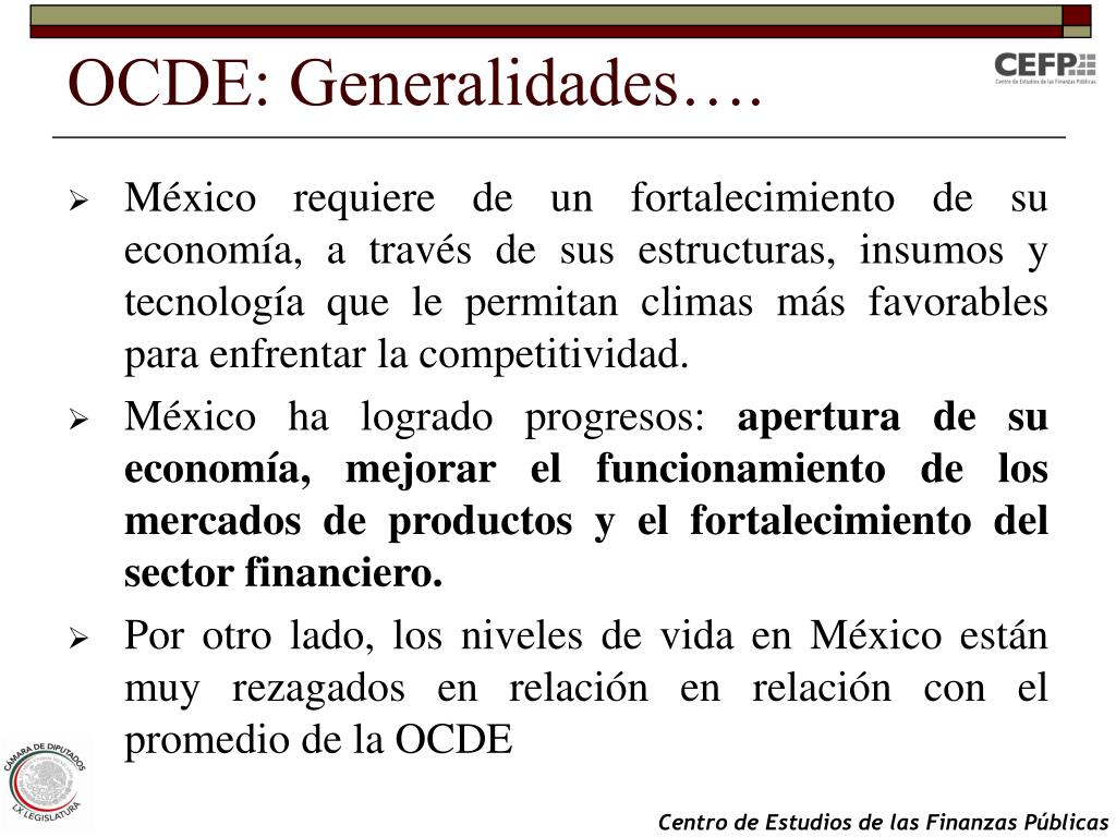 México requiere de un fortalecimiento de su economía, a través de sus estructuras, insumos y tecnología que le permitan climas más favorables para enfrentar la competitividad. México ha logrado progresos: apertura de su economía, mejorar el funcionamiento de los mercados de productos y el fortalecimiento del sector financiero. Por otro lado, los niveles de vida en México están muy rezagados en relación en relación con el promedio de la OCDE OCDE: Generalidades….
