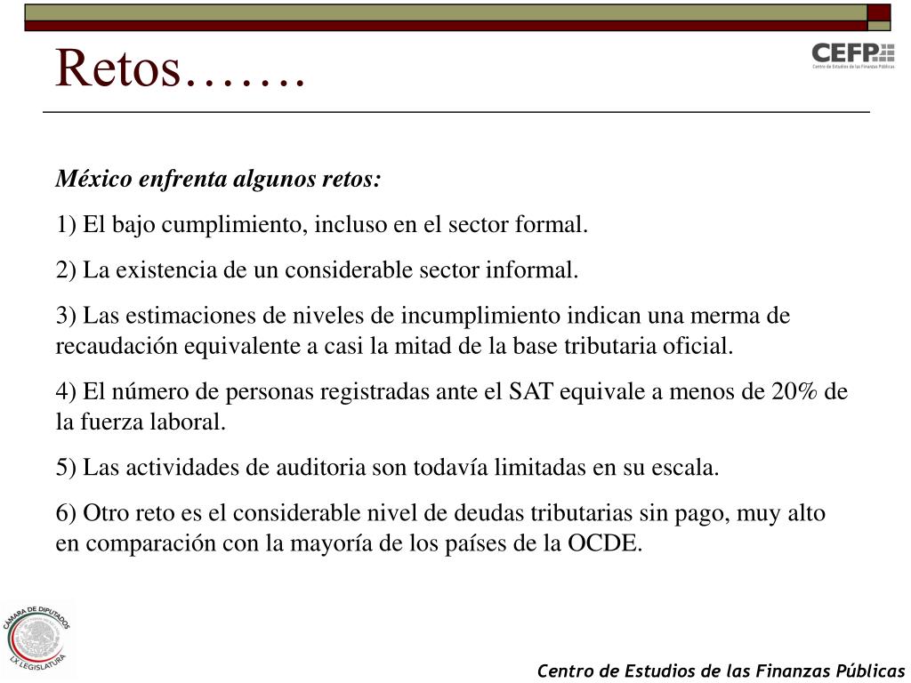 Retos……. México enfrenta algunos retos: 1) El bajo cumplimiento, incluso en el sector formal. 2) La existencia de un considerable sector informal. 3) Las estimaciones de niveles de incumplimiento indican una merma de recaudación equivalente a casi la mitad de la base tributaria oficial. 4) El número de personas registradas ante el SAT equivale a menos de 20% de la fuerza laboral. 5) Las actividades de auditoria son todavía limitadas en su escala. 6) Otro reto es el considerable nivel de deudas tributarias sin pago, muy alto en comparación con la mayoría de los países de la OCDE.
