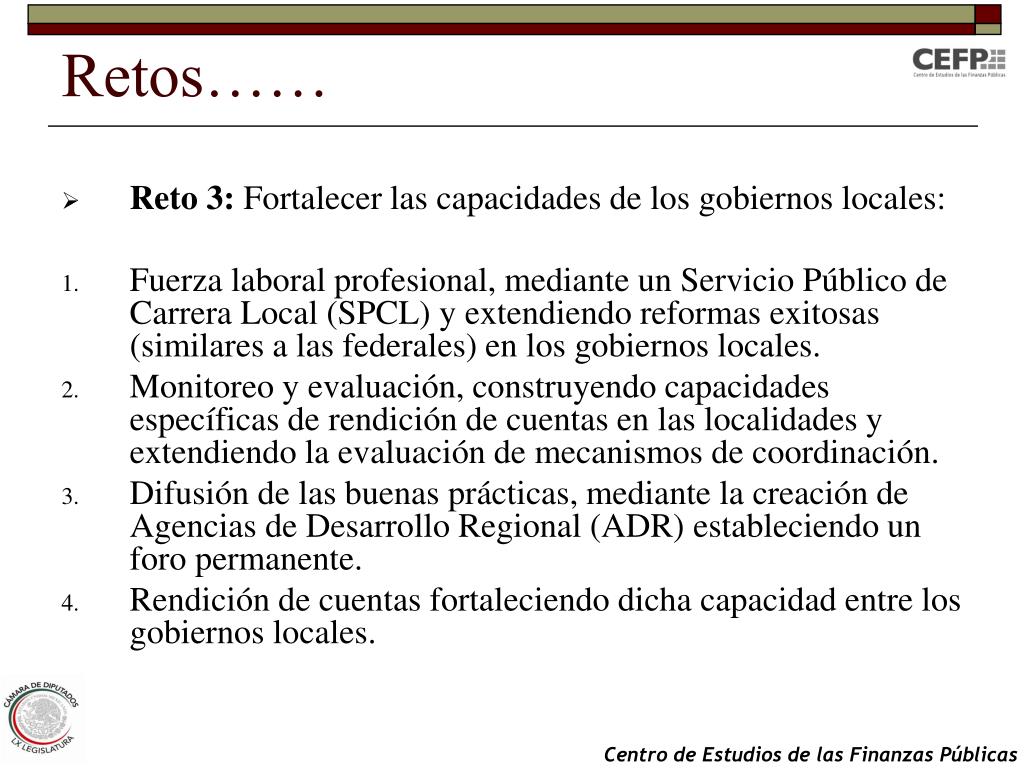 Reto 3: Fortalecer las capacidades de los gobiernos locales: Fuerza laboral profesional, mediante un Servicio Público de Carrera Local (SPCL) y extendiendo reformas exitosas (similares a las federales) en los gobiernos locales. Monitoreo y evaluación, construyendo capacidades específicas de rendición de cuentas en las localidades y extendiendo la evaluación de mecanismos de coordinación. Difusión de las buenas prácticas, mediante la creación de Agencias de Desarrollo Regional (ADR) estableciendo un foro permanente. Rendición de cuentas fortaleciendo dicha capacidad entre los gobiernos locales. Retos……