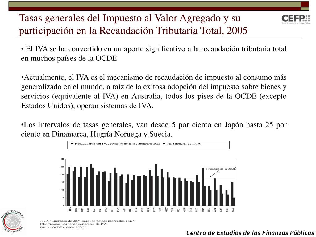México aplica tasa cero sobre una mayor cantidad de bienes. Según información de la OCDE, la experiencia indica que el IVA ha resultado ser adecuado para los países en desarrollo, ya que ha favorecido la recaudación de una manera mas eficiente puesto que requiere una menor infraestructura administrativa. Por otro lado, la OCDE, manifiesta que la complejidad del IVA genera cargas administrativas y reduce el cumplimiento de los contribuyentes. La eliminación de las exenciones y las tasas cero traería consigo ingresos adicionales sustanciales y reducirían el alcance de la evasión fiscal. Impuesto al Valor Agregado (IVA)