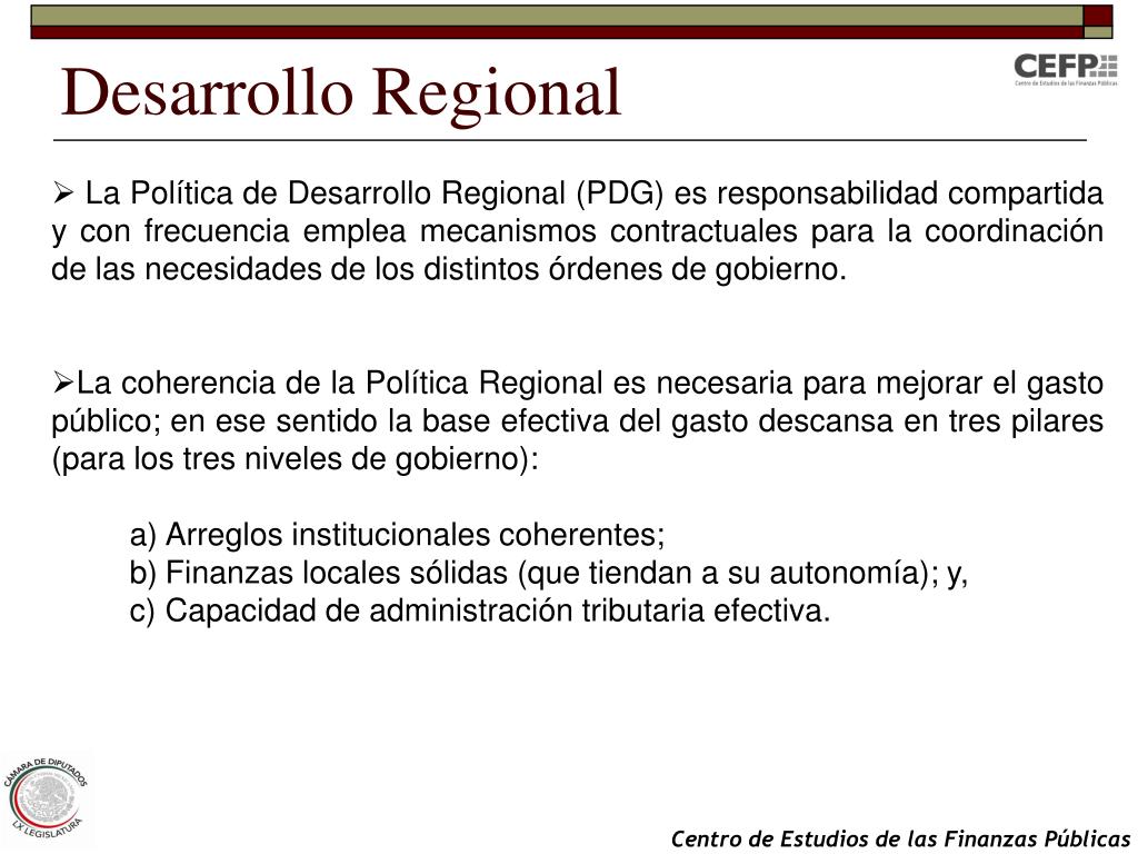 Desarrollo Regional • La Política de Desarrollo Regional (PDG) es responsabilidad compartida y con frecuencia emplea mecanismos contractuales para la coordinación de las necesidades de los distintos órdenes de gobierno. • La coherencia de la Política Regional es necesaria para mejorar el gasto público; en ese sentido la base efectiva del gasto descansa en tres pilares (para los tres niveles de gobierno): a) Arreglos institucionales coherentes; b) Finanzas locales sólidas (que tiendan a su autonomía); y, c) Capacidad de administración tributaria efectiva.