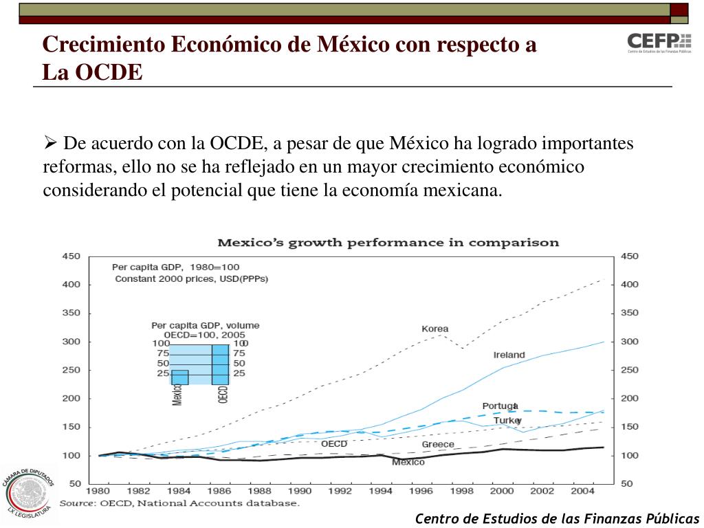 Crecimiento Económico de México con respecto a La OCDE • De acuerdo con la OCDE, a pesar de que México ha logrado importantes reformas, ello no se ha reflejado en un mayor crecimiento económico considerando el potencial que tiene la economía mexicana.