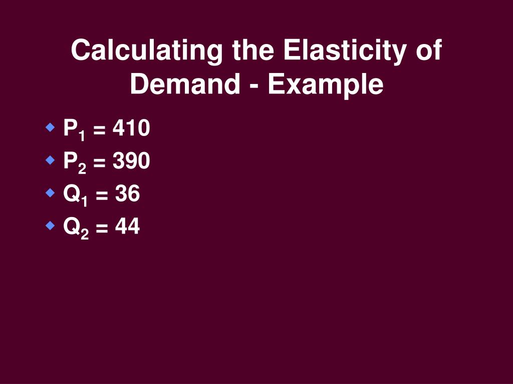Calculating the Elasticity of Demand - Example • P1 = 410 • P2 = 390 • Q1 = 36 • Q2 = 44