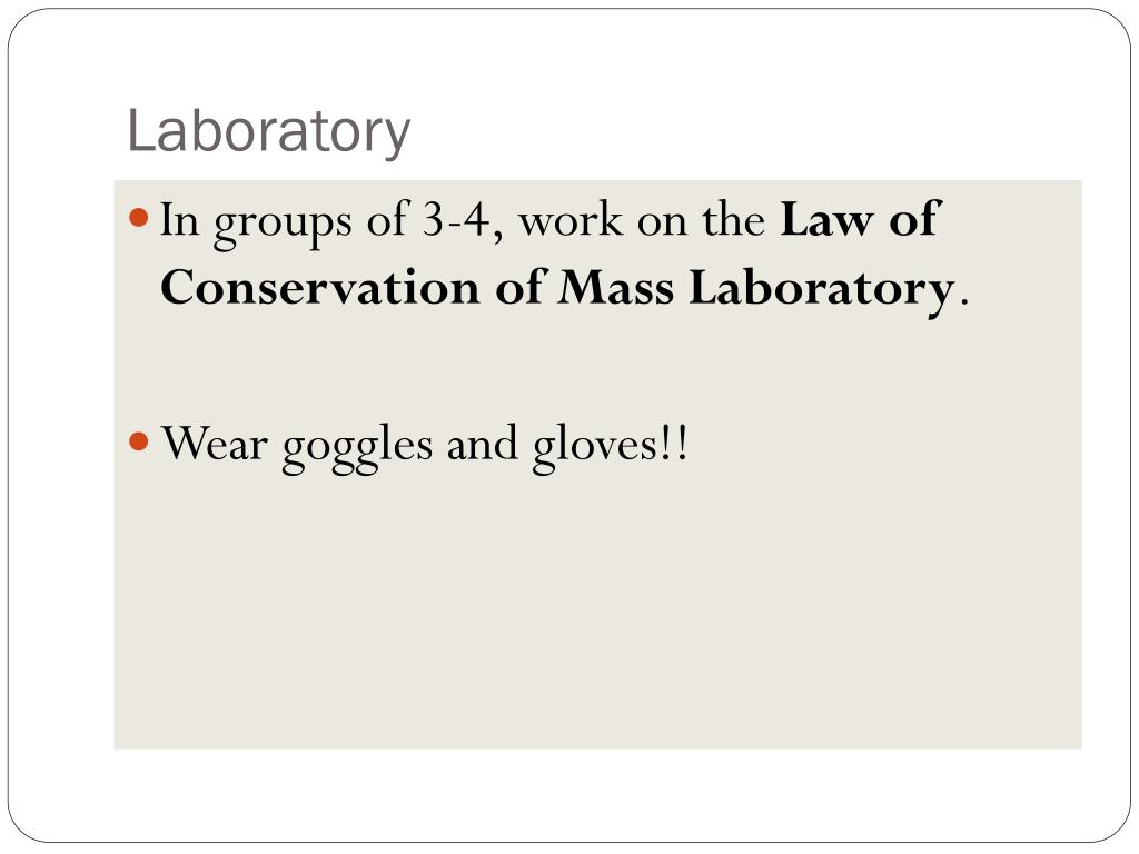 Laboratory • In groups of 3-4, work on the Law of Conservation of Mass Laboratory. • Wear goggles and gloves!!