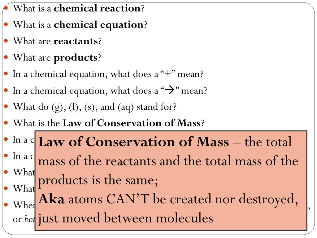 What is a chemical reaction? • What is a chemical equation? • What are reactants? • What are products? • In a chemical equation, what does a “+” mean? • In a chemical equation, what does a “” mean? • What do (g), (l), (s), and (aq) stand for? • What is the Law of Conservation of Mass? • In a chemical equation, what does a coefficient mean? • In a chemical equation, what does a subscript mean? • What is an unbalanced chemical equation? • What is a balanced chemical equation? • When balancing chemical equations, can we change coefficients, subscripts, or both? ONLY COEFFICIENTS CAN CHANGE!