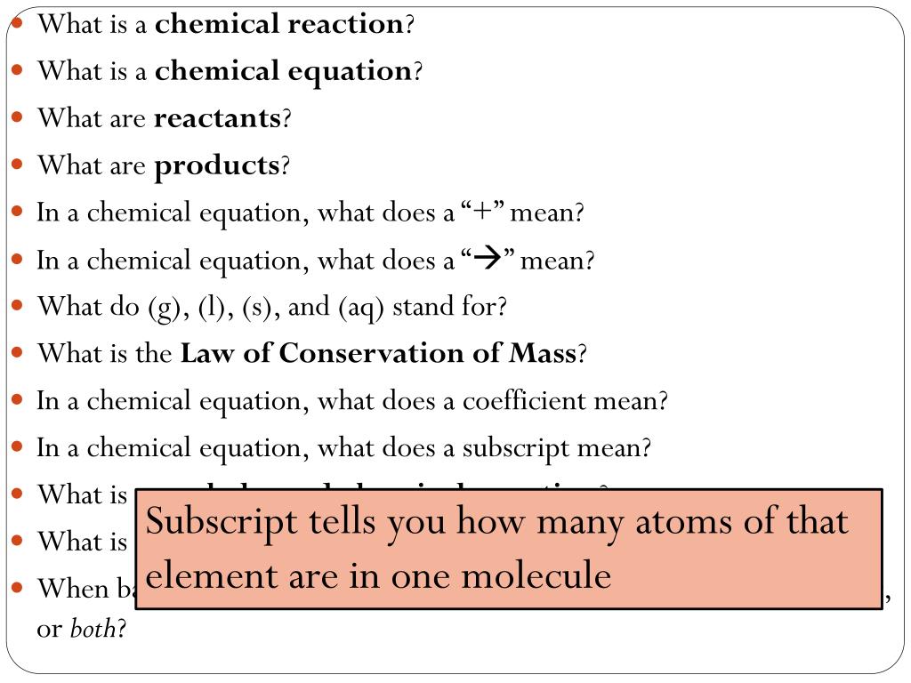 What is a chemical reaction? • What is a chemical equation? • What are reactants? • What are products? • In a chemical equation, what does a “+” mean? • In a chemical equation, what does a “” mean? • What do (g), (l), (s), and (aq) stand for? • What is the Law of Conservation of Mass? • In a chemical equation, what does a coefficient mean? • In a chemical equation, what does a subscript mean? • What is an unbalanced chemical equation? • What is a balanced chemical equation? • When balancing chemical equations, can we change coefficients, subscripts, or both? Subscript tells you how many atoms of that element are in one molecule