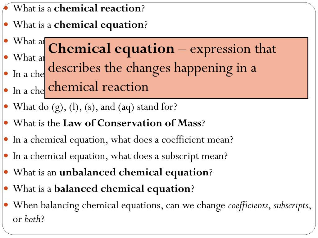 Chemical equation – expression that describes the changes happening in a chemical reaction • What is a chemical reaction? • What is a chemical equation? • What are reactants? • What are products? • In a chemical equation, what does a “+” mean? • In a chemical equation, what does a “” mean? • What do (g), (l), (s), and (aq) stand for? • What is the Law of Conservation of Mass? • In a chemical equation, what does a coefficient mean? • In a chemical equation, what does a subscript mean? • What is an unbalanced chemical equation? • What is a balanced chemical equation? • When balancing chemical equations, can we change coefficients, subscripts, or both?