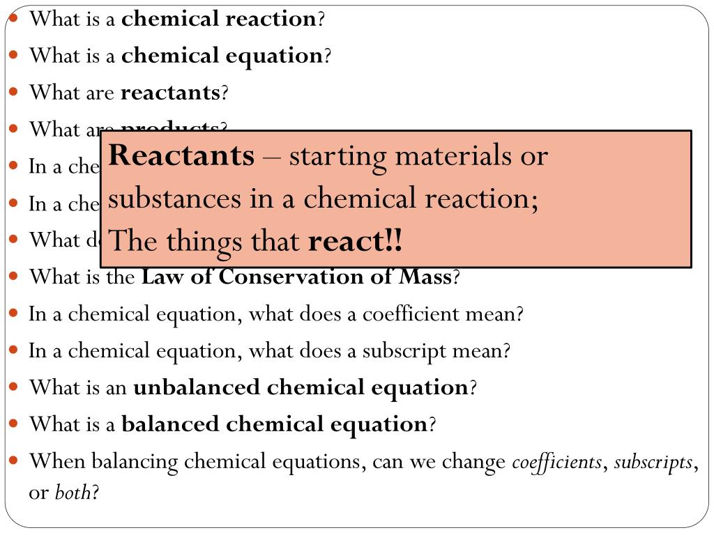 Chemical reaction – the process of chemical change • What is a chemical reaction? • What is a chemical equation? • What are reactants? • What are products? • In a chemical equation, what does a “+” mean? • In a chemical equation, what does a “” mean? • What do (g), (l), (s), and (aq) stand for? • What is the Law of Conservation of Mass? • In a chemical equation, what does a coefficient mean? • In a chemical equation, what does a subscript mean? • What is an unbalanced chemical equation? • What is a balanced chemical equation? • When balancing chemical equations, can we change coefficients, subscripts, or both?