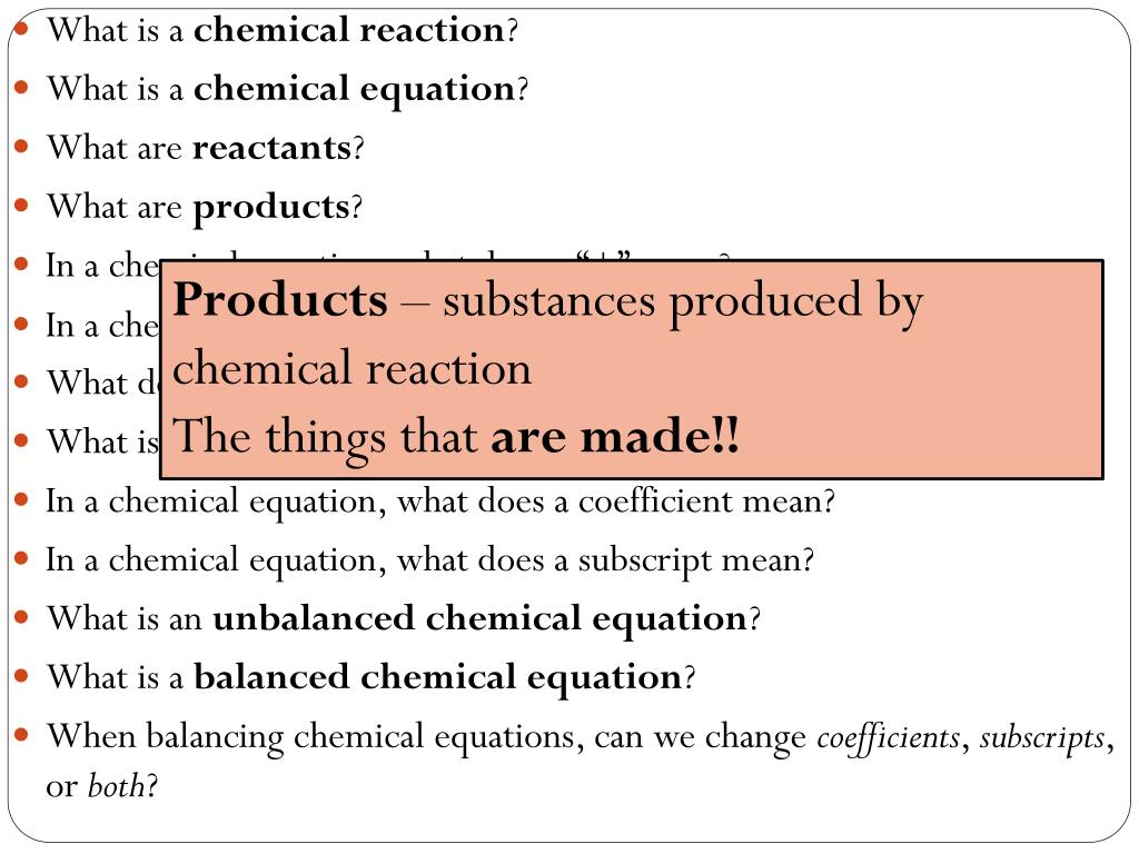 What is a chemical reaction? • What is a chemical equation? • What are reactants? • What are products? • In a chemical equation, what does a “+” mean? • In a chemical equation, what does a “” mean? • What do (g), (l), (s), and (aq) stand for? • What is the Law of Conservation of Mass? • In a chemical equation, what does a coefficient mean? • In a chemical equation, what does a subscript mean? • What is an unbalanced chemical equation? • What is a balanced chemical equation? • When balancing chemical equations, can we change coefficients, subscripts, or both? Products – substances produced by chemical reaction The things that are made!!