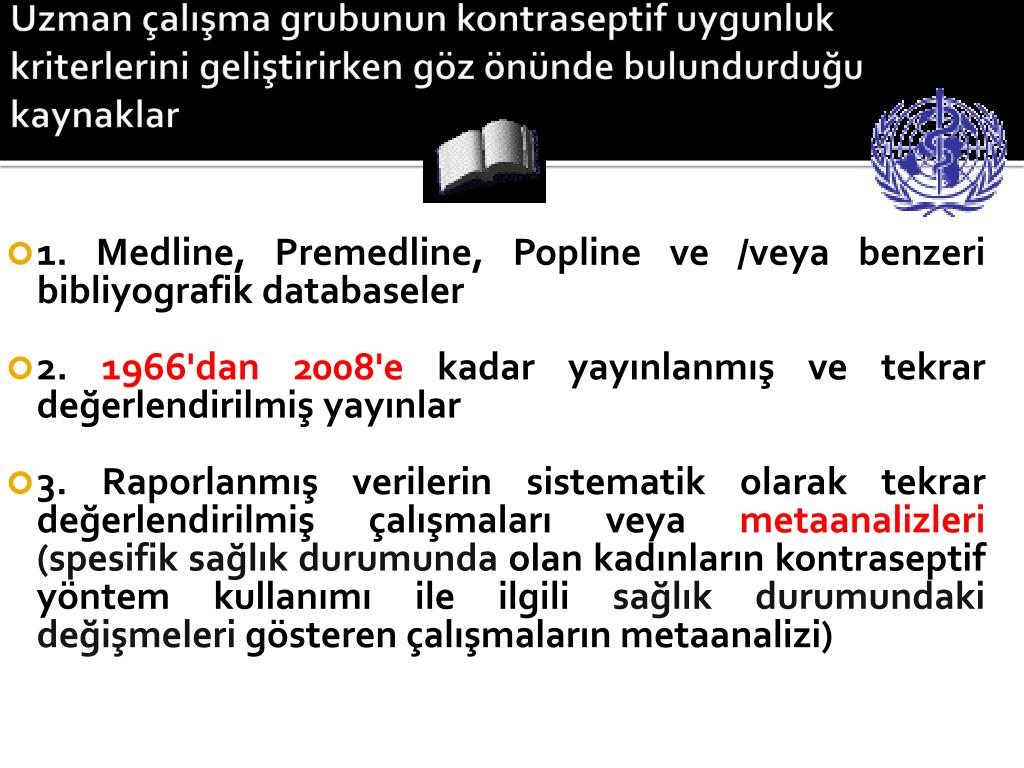 Uzman çalışma grubunun kontraseptif uygunluk kriterlerini geliştirirken göz önünde bulundurduğu kaynaklar • 1. Medline, Premedline, Popline ve /veya benzeri bibliyografik databaseler • 2. 1966'dan 2008'e kadar yayınlanmış ve tekrar değerlendirilmiş yayınlar • 3. Raporlanmış verilerin sistematik olarak tekrar değerlendirilmiş çalışmaları veya metaanalizleri (spesifik sağlık durumunda olan kadınların kontraseptif yöntem kullanımı ile ilgili sağlık durumundaki değişmeleri gösteren çalışmaların metaanalizi)