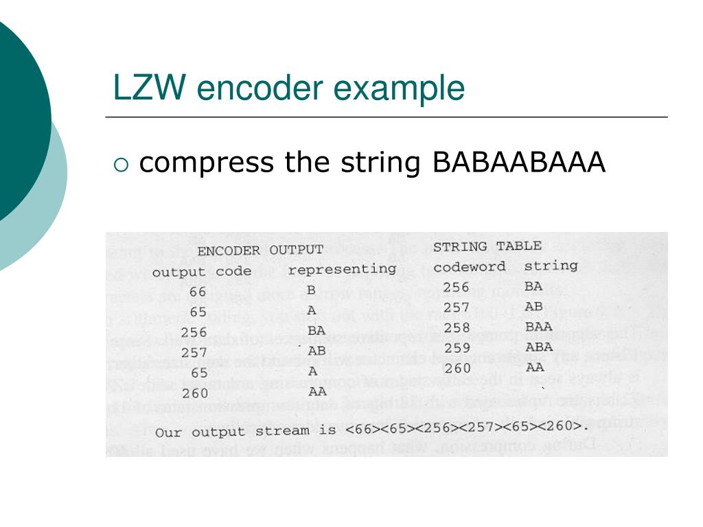 LZW encoder Initialize table with single character strings STRING = first input character WHILE not end of input stream CHARACTER = next input character IF STRING + CHARACTER is in the string table STRING = STRING + CHARACTER ELSE Output the code for STRING Add STRING + CHARACTER to the string table STRING = CHARACTER END WHILE Output code for string
