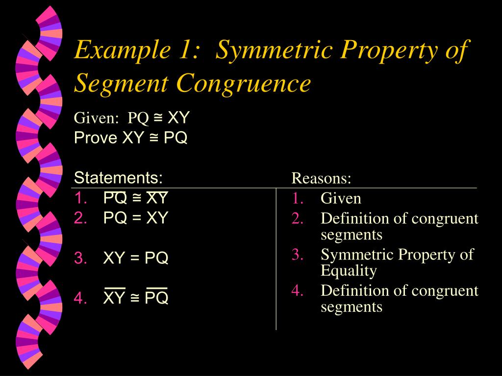 Given: PQ ≅ XY Prove XY ≅ PQ Statements: PQ ≅ XY PQ = XY XY = PQ XY ≅ PQ Reasons: Given Definition of congruent segments Symmetric Property of Equality Definition of congruent segments Example 1: Symmetric Property of Segment Congruence