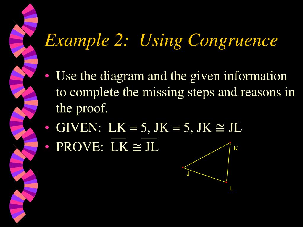 Example 2: Using Congruence • Use the diagram and the given information to complete the missing steps and reasons in the proof. • GIVEN: LK = 5, JK = 5, JK ≅ JL • PROVE: LK ≅ JL