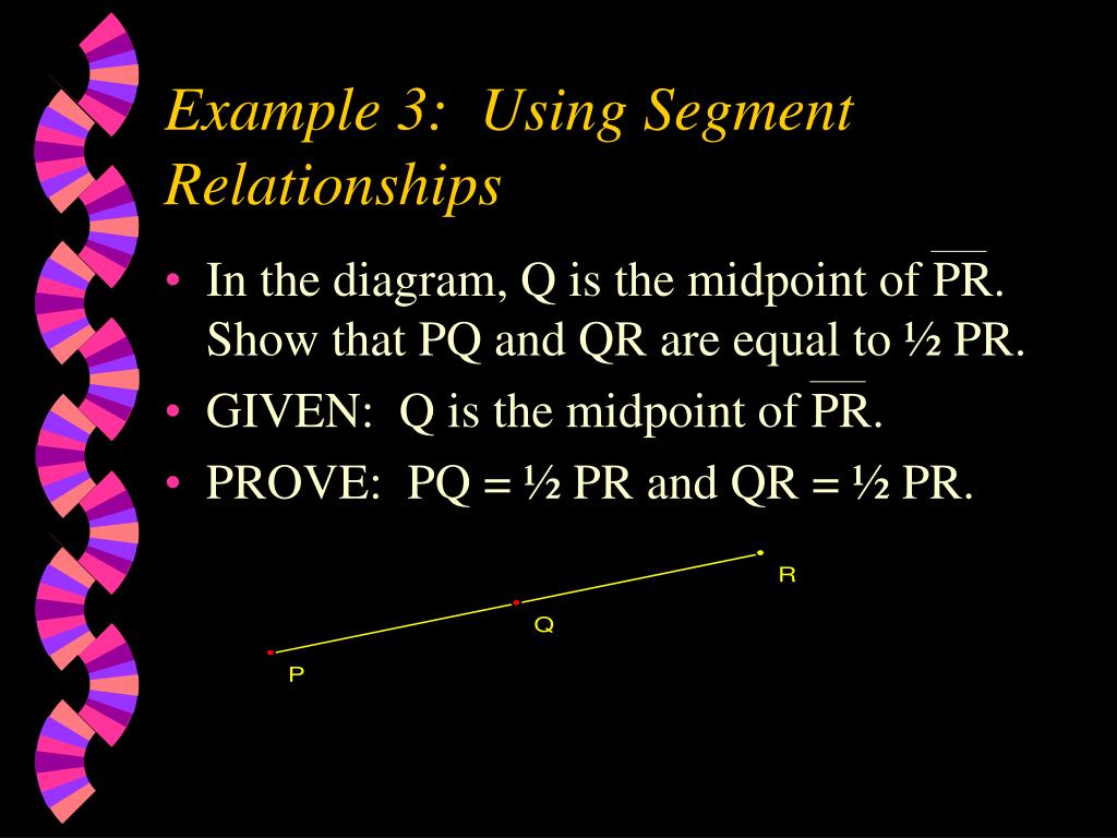 Example 3: Using Segment Relationships • In the diagram, Q is the midpoint of PR. Show that PQ and QR are equal to ½ PR. • GIVEN: Q is the midpoint of PR. • PROVE: PQ = ½ PR and QR = ½ PR.