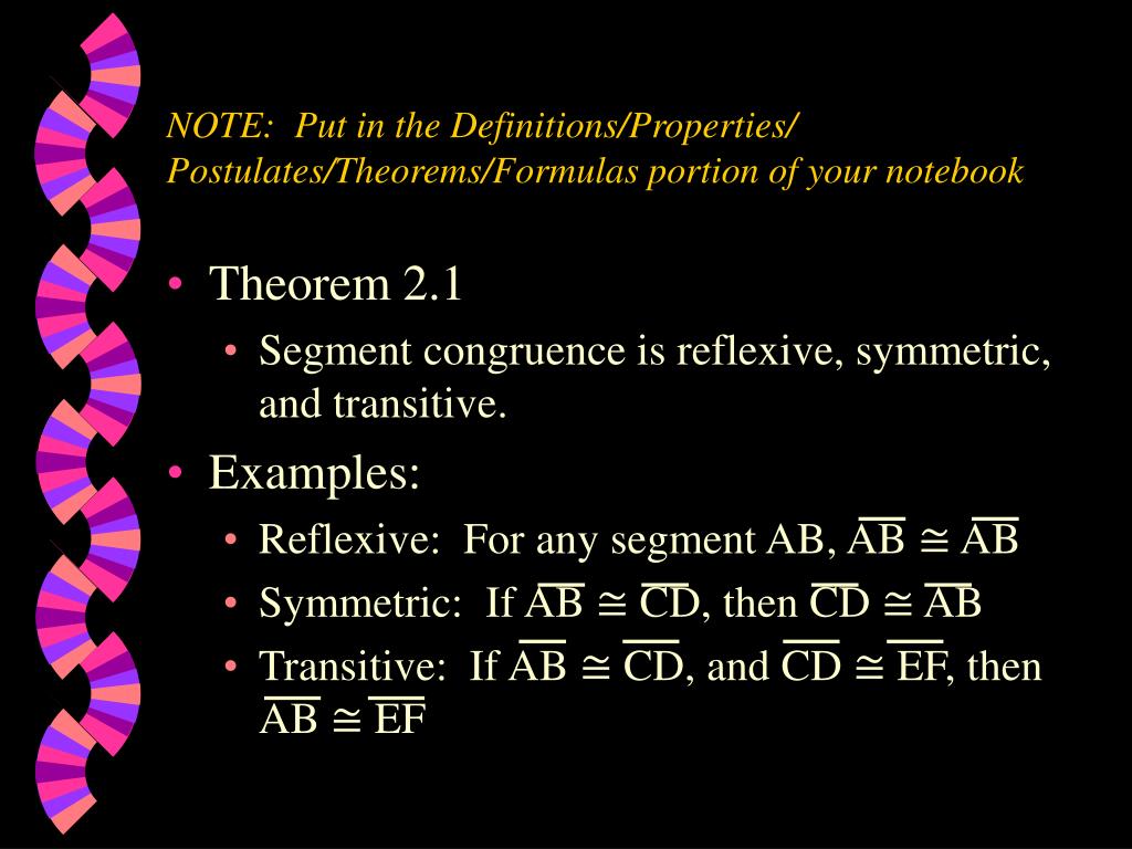 NOTE: Put in the Definitions/Properties/ Postulates/Theorems/Formulas portion of your notebook • Theorem 2.1 • Segment congruence is reflexive, symmetric, and transitive. • Examples: • Reflexive: For any segment AB, AB ≅ AB • Symmetric: If AB ≅ CD, then CD ≅ AB • Transitive: If AB ≅ CD, and CD ≅ EF, then AB ≅ EF