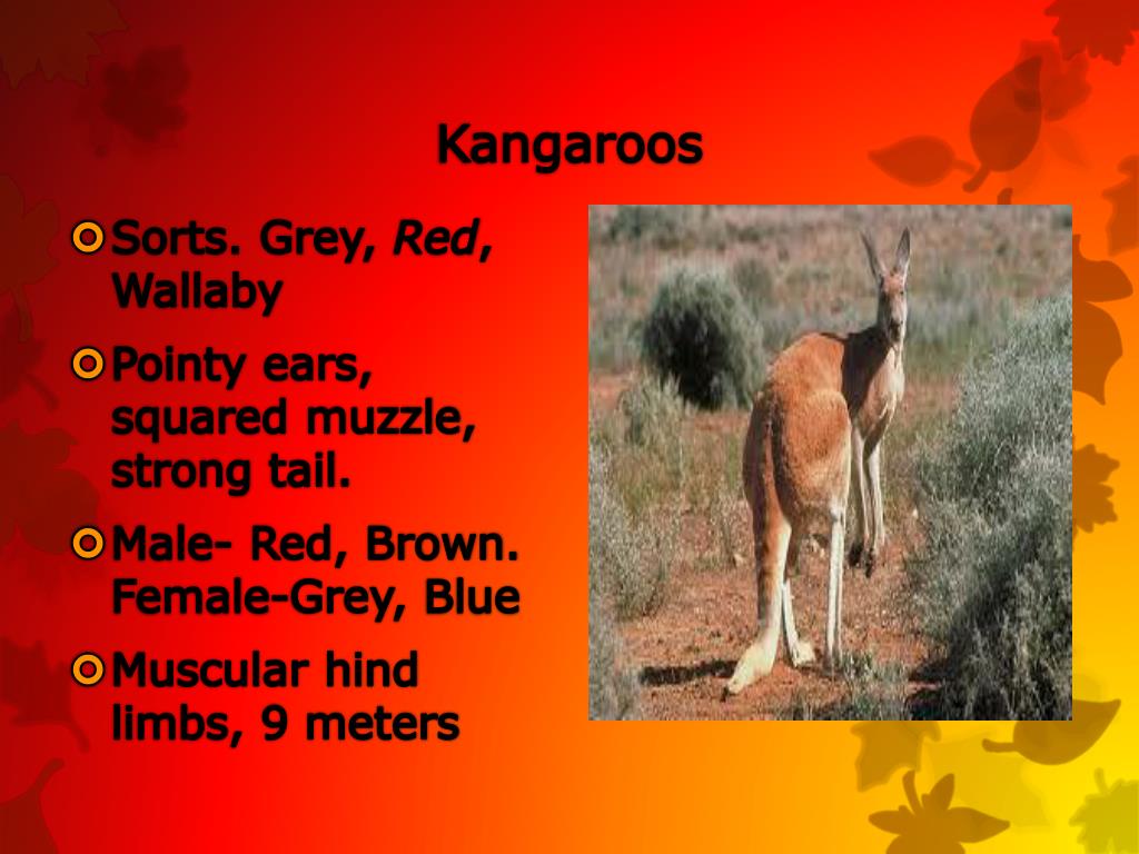 Kangaroos • Sorts. Grey, Red, Wallaby • Pointyears, squaredmuzzle, strong tail. • Male- Red, Brown. Female-Grey, Blue • Muscular hind limbs, 9 meters