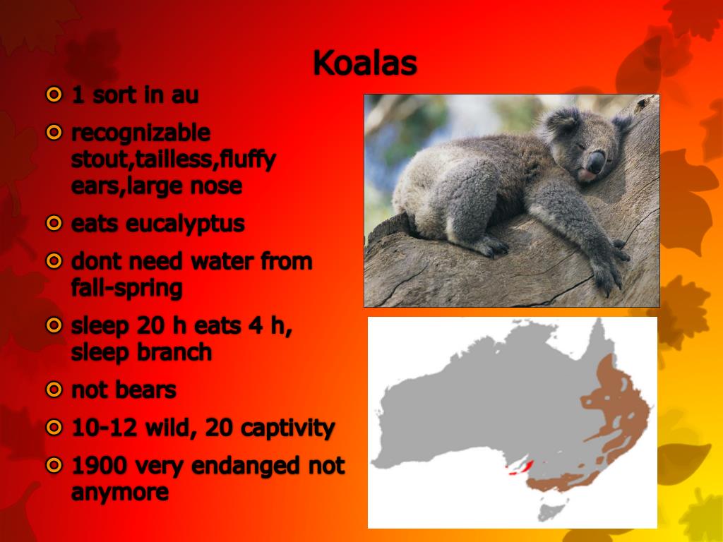 Koalas • 1 sort in au • recognizablestout,tailless,fluffyears,largenose • eatseucalyptus • dontneedwater from fall-spring • sleep20 h eats 4 h, sleepbranch • not bears • 10-12 wild, 20 captivity • 1900 veryendanged not anymore