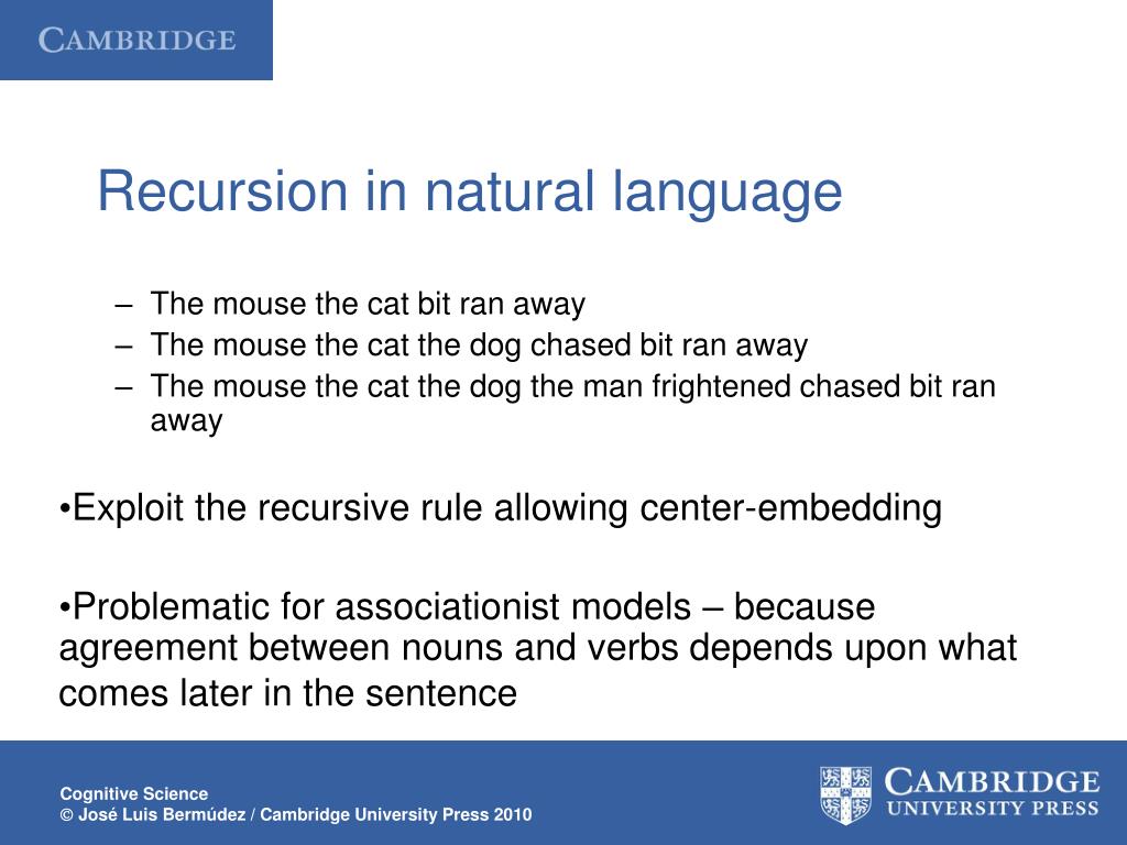 Recursion in natural language The mouse the cat bit ran away The mouse the cat the dog chased bit ran away The mouse the cat the dog the man frightened chased bit ran away Exploit the recursive rule allowing center-embedding Problematic for associationist models – because agreement between nouns and verbs depends upon what comes later in the sentence Cognitive Science José Luis Bermúdez / Cambridge University Press 2010