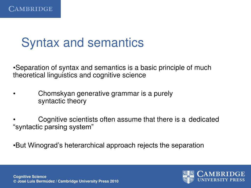 Syntax and semantics Separation of syntax and semantics is a basic principle of much theoretical linguistics and cognitive science Chomskyan generative grammar is a purely syntactic theory Cognitive scientists often assume that there is a dedicated “syntactic parsing system” But Winograd’s heterarchical approach rejects the separation Cognitive Science José Luis Bermúdez / Cambridge University Press 2010
