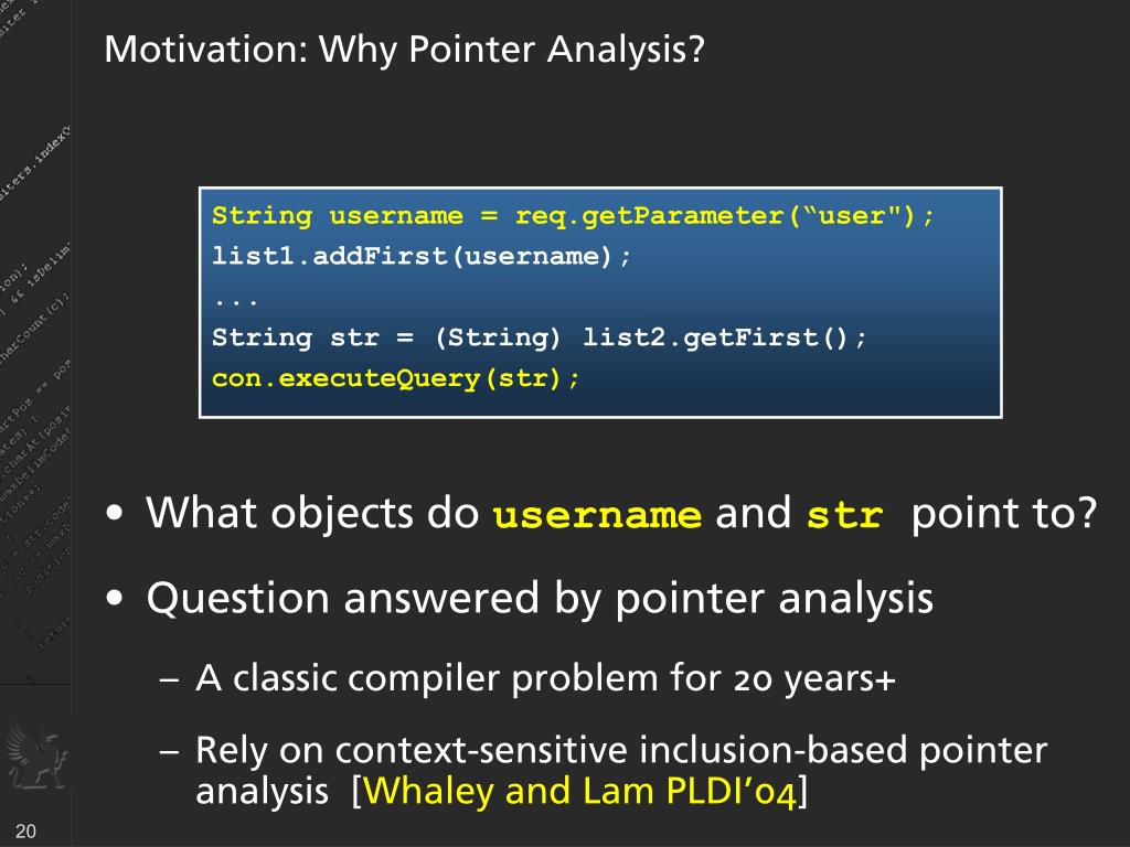 Motivation: Why Pointer Analysis? • What objects do usernameand strpoint to? • Question answered by pointer analysis • A classic compiler problem for 20 years+ • Rely on context-sensitive inclusion-based pointer analysis [Whaley and Lam PLDI’04] String username = req.getParameter(“user"); list1.addFirst(username); ... String str = (String) list2.getFirst(); con.executeQuery(str);