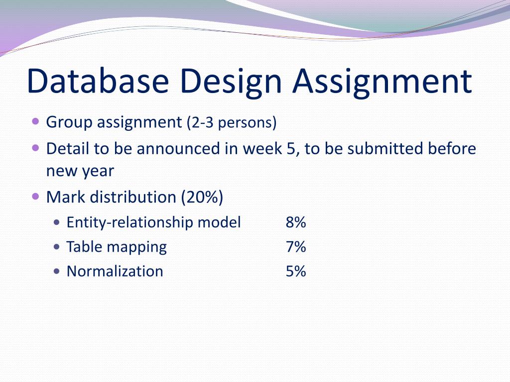 Database Design Assignment • Group assignment (2-3 persons) • Detail to be announced in week 5, to be submitted before new year • Mark distribution (20%) • Entity-relationship model 8% • Table mapping 7% • Normalization 5%