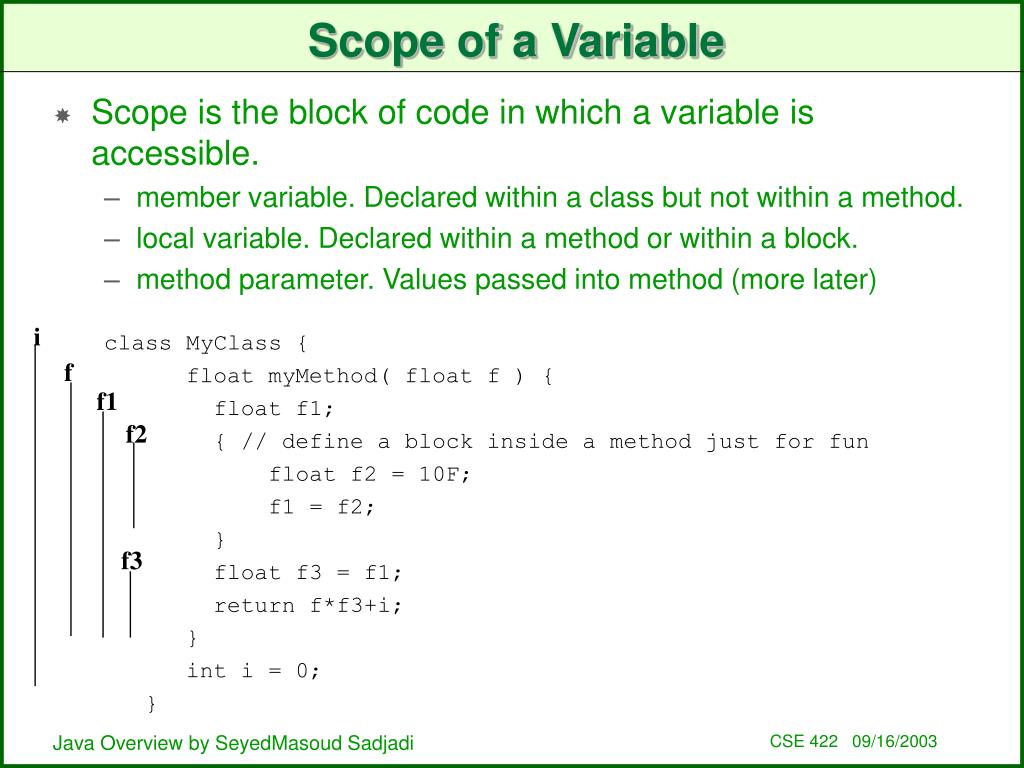 Scope of a Variable • Scope is the block of code in which a variable is accessible. • member variable. Declared within a class but not within a method. • local variable. Declared within a method or within a block. • method parameter. Values passed into method (more later) class MyClass { float myMethod( float f ) { float f1; { // define a block inside a method just for fun float f2 = 10F; f1 = f2; } float f3 = f1; return f*f3+i; } int i = 0; } i f f1 f2 f3