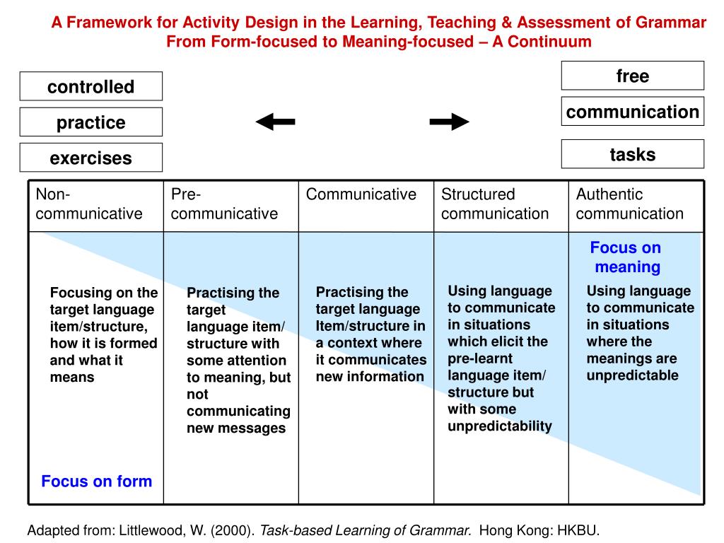 A Framework for Activity Design in the Learning, Teaching & Assessment of Grammar From Form-focused to Meaning-focused – A Continuum free controlled communication practice tasks exercises Non-communicative Pre-communicative Communicative Structured communication Authentic communication Focusing on the target language item/structure, how it is formed and what it means Focus on meaning Practising the target language Item/structure in a context where it communicates new information Practising the target language item/ structure with some attention to meaning, but not communicating new messages Using language to communicate in situations which elicit the pre-learnt language item/ structure but with some unpredictability Using language to communicate in situations where the meanings are unpredictable Focus on form Adapted from: Littlewood, W. (2000). Task-based Learning of Grammar. Hong Kong: HKBU.