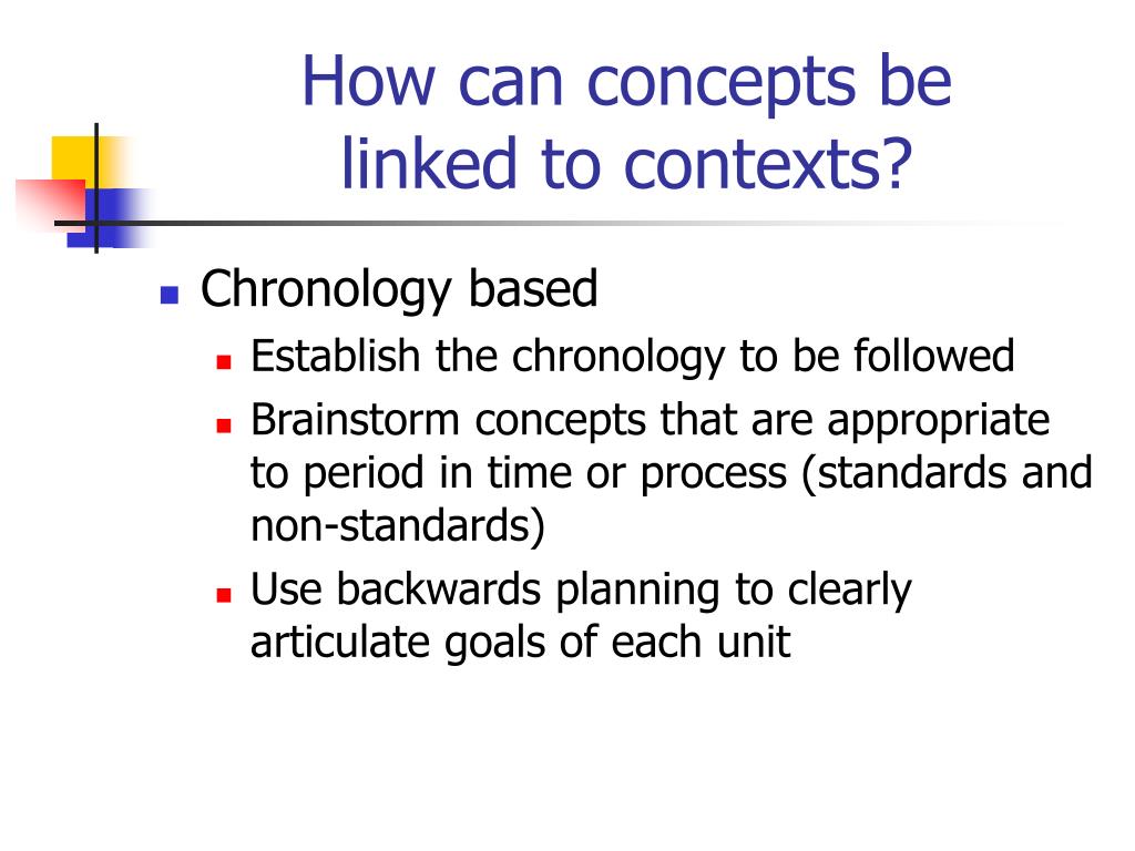 How can concepts be linked to contexts? • Chronology based • Establish the chronology to be followed • Brainstorm concepts that are appropriate to period in time or process (standards and non-standards) • Use backwards planning to clearly articulate goals of each unit