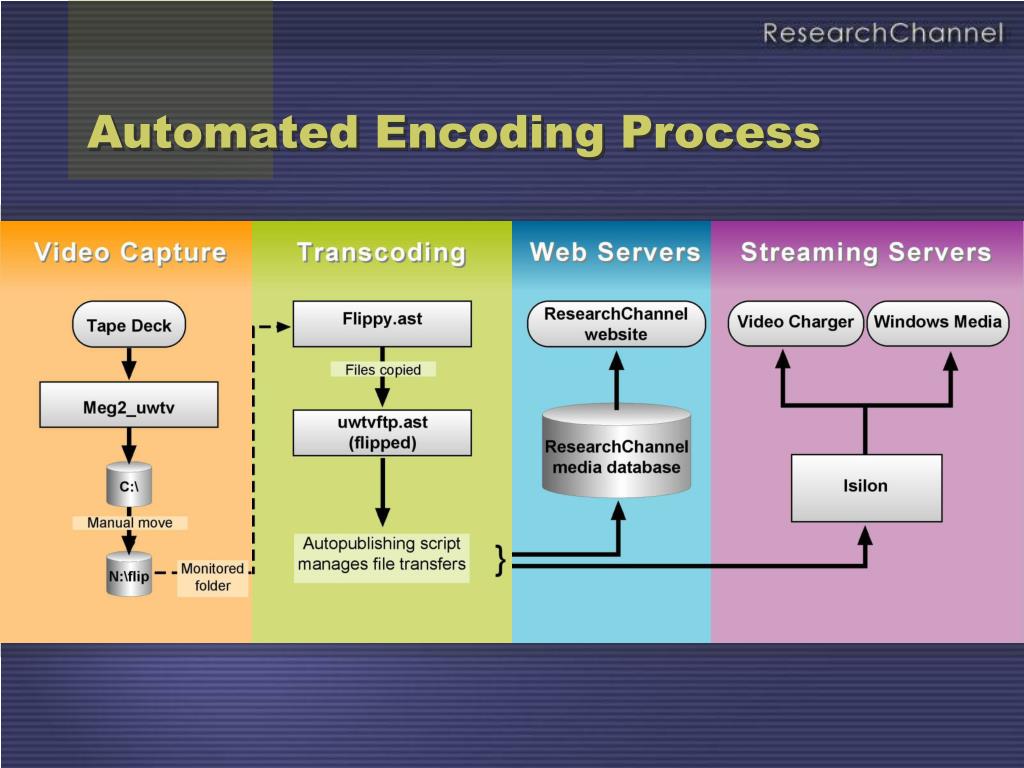 Broadcast Scheduling Integration • Broadcast Traffic & Web Integration • Program metadata store (DigitalWell) • Broadcast schedule (ProTrack, Louth) • Daily extract ProTrack list metadata • Synchronize metadata (ProTrack, DigitalWell) • Tape number and program name • Dynamic generation of ResearchChannel Web • Broadcast schedule • VoD library
