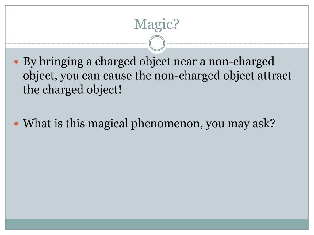 Magic? By bringing a charged object near a non-charged object, you can cause the non-charged object attract the charged object! What is this magical phenomenon, you may ask?