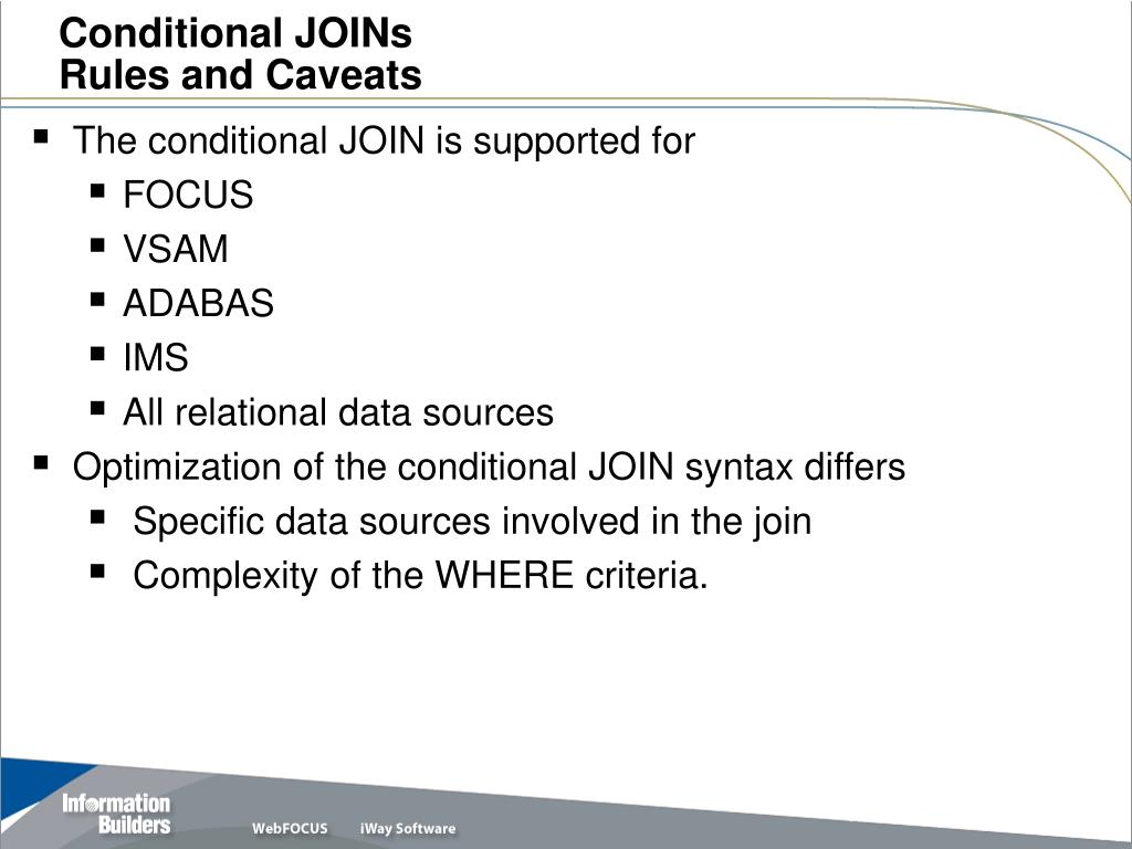 Conditional JOINsRules and Caveats • The conditional JOIN is supported for • FOCUS • VSAM • ADABAS • IMS • All relational data sources • Optimization of the conditional JOIN syntax differs • Specific data sources involved in the join • Complexity of the WHERE criteria.