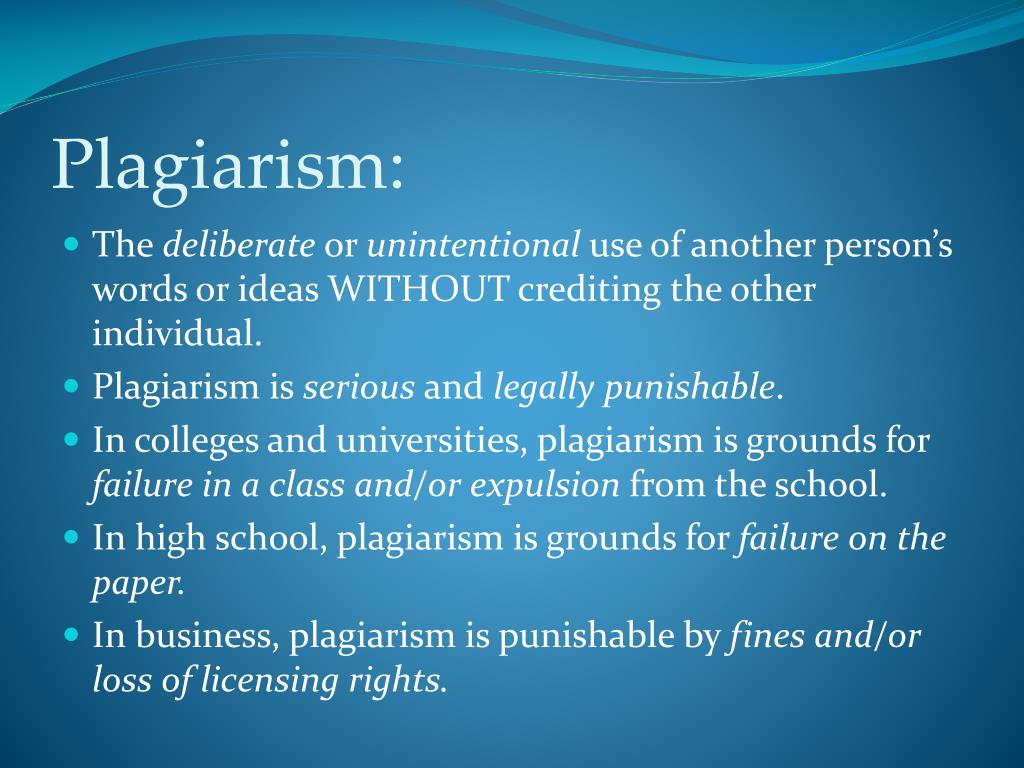 Plagiarism: • The deliberate or unintentional use of another person’s words or ideas WITHOUT crediting the other individual. • Plagiarism is serious and legally punishable. • In colleges and universities, plagiarism is grounds for failure in a class and/or expulsion from the school. • In high school, plagiarism is grounds for failure on the paper. • In business, plagiarism is punishable by fines and/or loss of licensing rights.