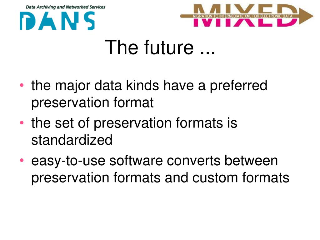 The future ... • the major data kinds have a preferred preservation format • the set of preservation formats is standardized • easy-to-use software converts between preservation formats and custom formats