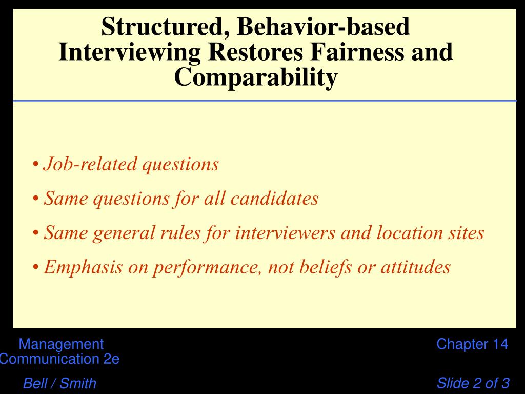 Structured, Behavior-based Interviewing Restores Fairness and Comparability • Job-related questions • Same questions for all candidates • Same general rules for interviewers and location sites • Emphasis on performance, not beliefs or attitudes