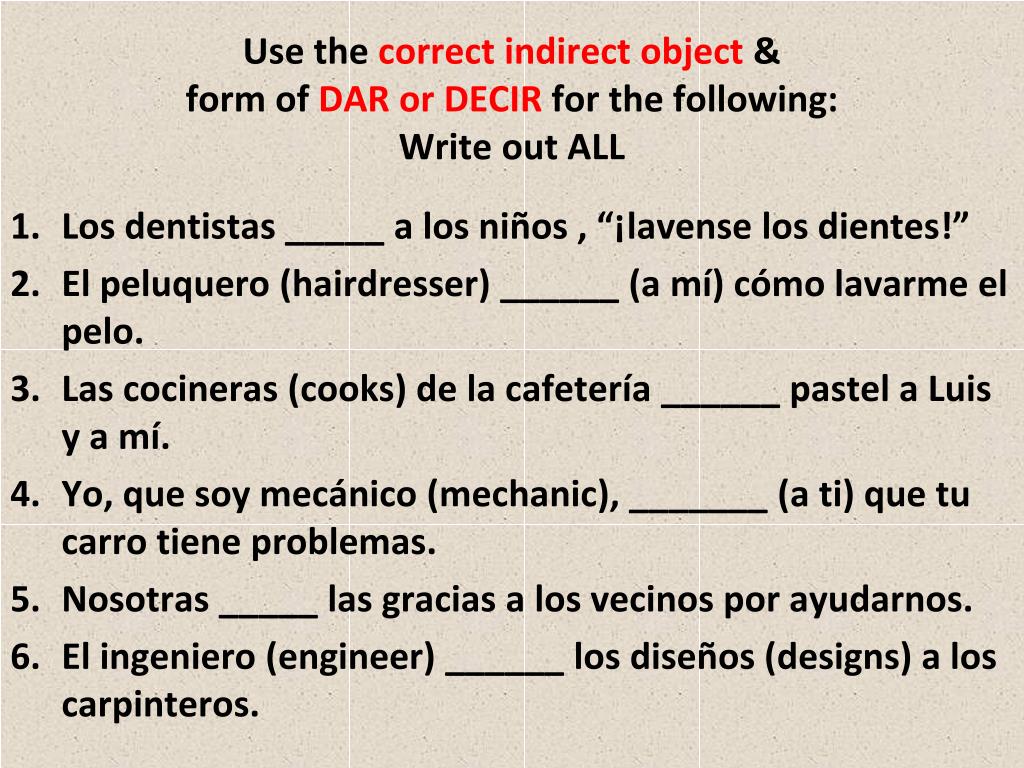 Use the correct indirect object & form of DAR or DECIR for the following: • 1. Los dentistas LES DICEN a los niños , “¡lavense los dientes!” • 2. El peluquero ME DICE (a mí) cómo lavarme el pelo. • 3. Las cocineras de la cafetería NOS DAN pastel a Luis y a mí. • 4. Yo, que soy mecánico, TE DIGO (a ti) que tu carro tiene problemas. • 5. Nosotras LES DAMOS las gracias a los vecinos por ayudarnos. • 6. El ingeniero LES DA los diseños (designs) a los carpinteros.