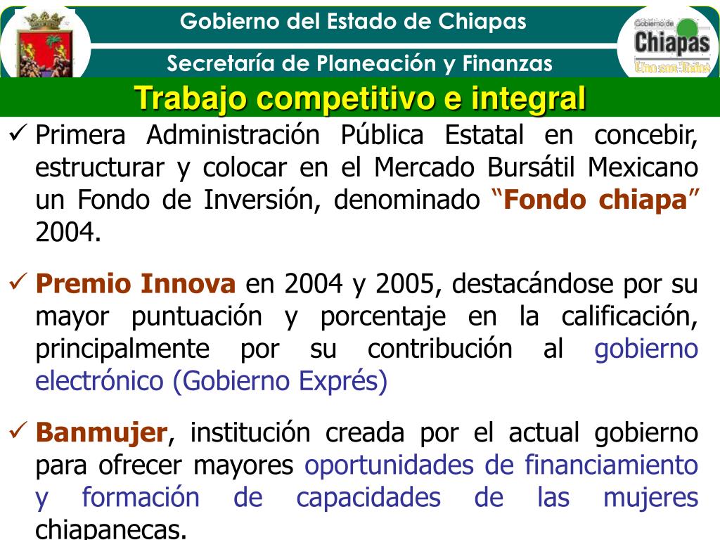 Trabajo competitivo e integral • Primera Administración Pública Estatal en concebir, estructurar y colocar en el Mercado Bursátil Mexicano un Fondo de Inversión, denominado “Fondo chiapa” 2004. • Premio Innova en 2004 y 2005, destacándose por su mayor puntuación y porcentaje en la calificación, principalmente por su contribución al gobierno electrónico (Gobierno Exprés) • Banmujer, institución creada por el actual gobierno para ofrecer mayores oportunidades de financiamiento y formación de capacidades de las mujeres chiapanecas.
