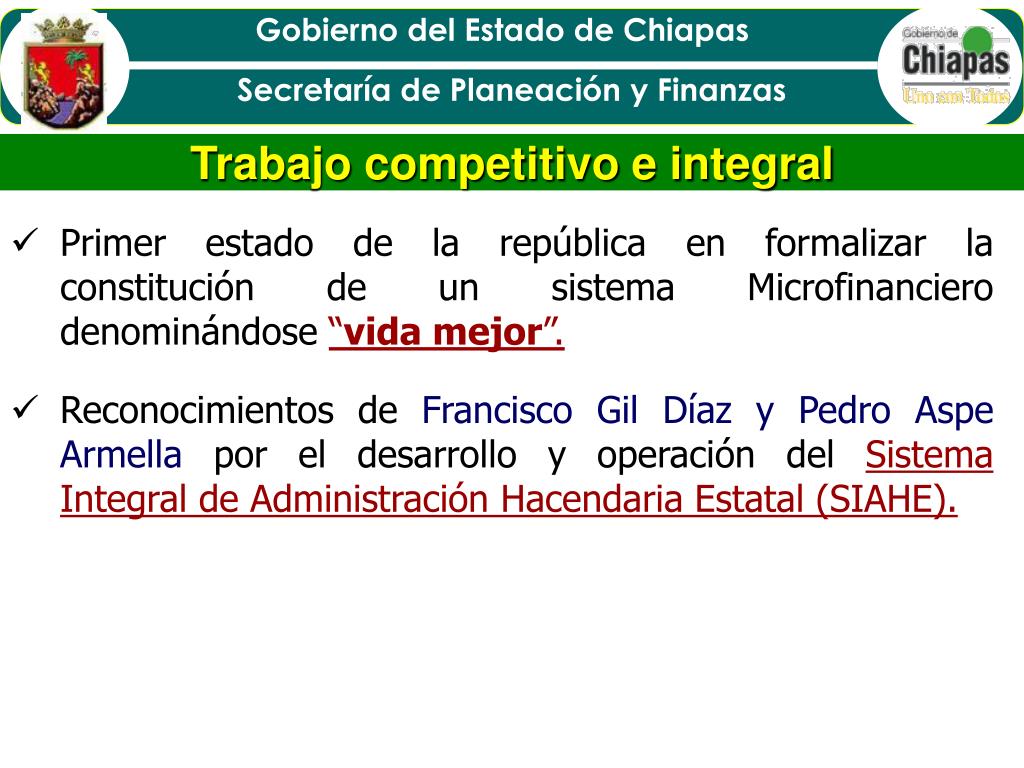 Trabajo competitivo e integral • Primer estado de la república en formalizar la constitución de un sistema Microfinanciero denominándose “vida mejor”. • Reconocimientos de Francisco Gil Díaz y Pedro Aspe Armella por el desarrollo y operación del Sistema Integral de Administración Hacendaria Estatal (SIAHE).