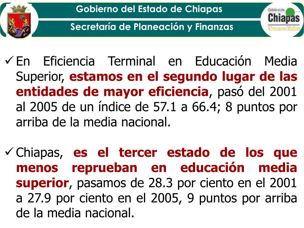 En Eficiencia Terminal en Educación Media Superior, estamos en el segundo lugar de las entidades de mayor eficiencia, pasó del 2001 al 2005 de un índice de 57.1 a 66.4; 8 puntos por arriba de la media nacional. • Chiapas, es el tercer estado de los que menos reprueban en educación media superior, pasamos de 28.3 por ciento en el 2001 a 27.9 por ciento en el 2005, 9 puntos por arriba de la media nacional.