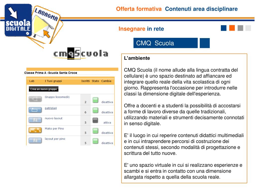 Offerta formativa: insegnare in rete. Offerta formativa Contenuti area disciplinare. Insegnare in rete. CMQ Scuola. L’ambiente