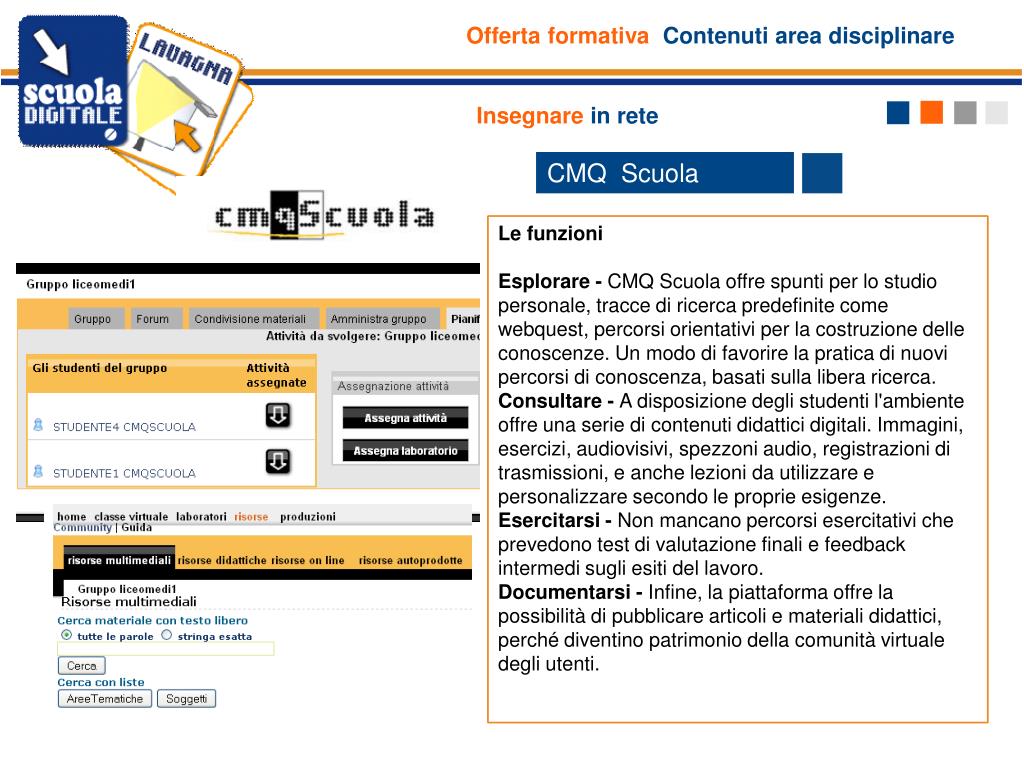 Offerta formativa Contenuti area disciplinare Insegnare in rete CMQ Scuola L’ambiente CMQ Scuola (il nome allude alla lingua contratta del cellulare) è uno spazio destinato ad affiancare ed integrare quello reale della vita scolastica di ogni giorno. Rappresenta l'occasione per introdurre nelle classi la dimensione digitale dell'esperienza.Offre a docenti e a studenti la possibilità di accostarsi a forme di lavoro diverse da quelle tradizionali, utilizzando materiali e strumenti decisamente connotati in senso digitale. E' il luogo in cui reperire contenuti didattici multimediali e in cui intraprendere percorsi di costruzione dei contenuti stessi, secondo modalità di progettazione e scrittura del tutto nuove. E' uno spazio virtuale in cui si realizzano esperienze e scambi e si entra in contatto con una dimensione allargata rispetto a quella della scuola reale.