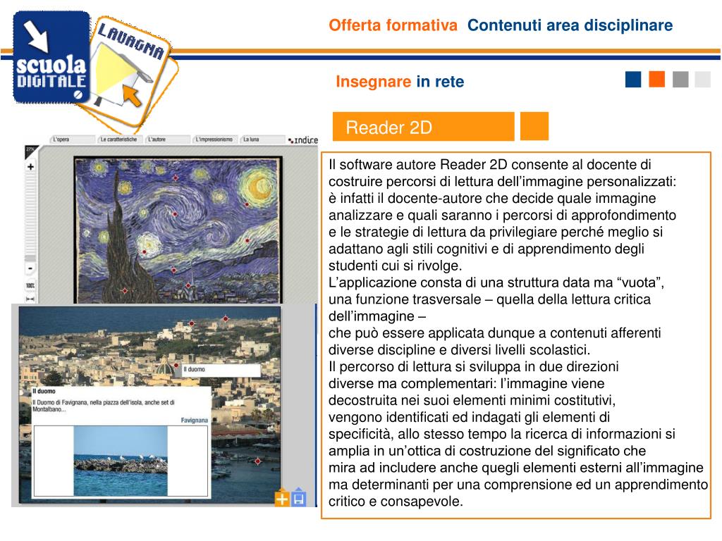 Offerta formativa Contenuti area disciplinare Insegnare in rete Reader 2D Il software autore Reader 2D consente al docente di costruire percorsi di lettura dell’immagine personalizzati: è infatti il docente-autore che decide quale immagine analizzare e quali saranno i percorsi di approfondimento e le strategie di lettura da privilegiare perché meglio si adattano agli stili cognitivi e di apprendimento degli studenti cui si rivolge. L’applicazione consta di una struttura data ma “vuota”, una funzione trasversale – quella della lettura critica dell’immagine – che può essere applicata dunque a contenuti afferenti diverse discipline e diversi livelli scolastici. Il percorso di lettura si sviluppa in due direzioni diverse ma complementari: l’immagine viene decostruita nei suoi elementi minimi costitutivi, vengono identificati ed indagati gli elementi di specificità, allo stesso tempo la ricerca di informazioni si amplia in un’ottica di costruzione del significato che mira ad includere anche quegli elementi esterni all’immagine ma determinanti per una comprensione ed un apprendimento critico e consapevole.