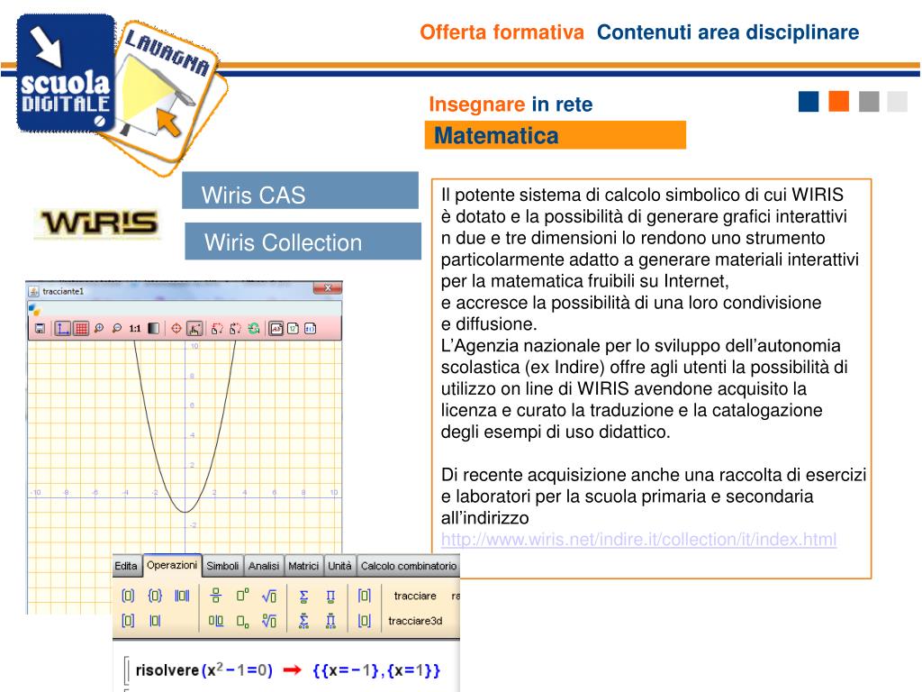 Offerta formativa Contenuti area disciplinare Insegnare in rete Matematica Wiris CAS Il potente sistema di calcolo simbolico di cui WIRIS è dotato e la possibilità di generare grafici interattivi n due e tre dimensioni lo rendono uno strumento particolarmente adatto a generare materiali interattivi per la matematica fruibili su Internet, e accresce la possibilità di una loro condivisione e diffusione. L’Agenzia nazionale per lo sviluppo dell’autonomia scolastica (ex Indire) offre agli utenti la possibilità di utilizzo on line di WIRIS avendone acquisito la licenza e curato la traduzione e la catalogazione degli esempi di uso didattico. Di recente acquisizione anche una raccolta di esercizi e laboratori per la scuola primaria e secondaria all’indirizzo http://www.wiris.net/indire.it/collection/it/index.html Wiris Collection