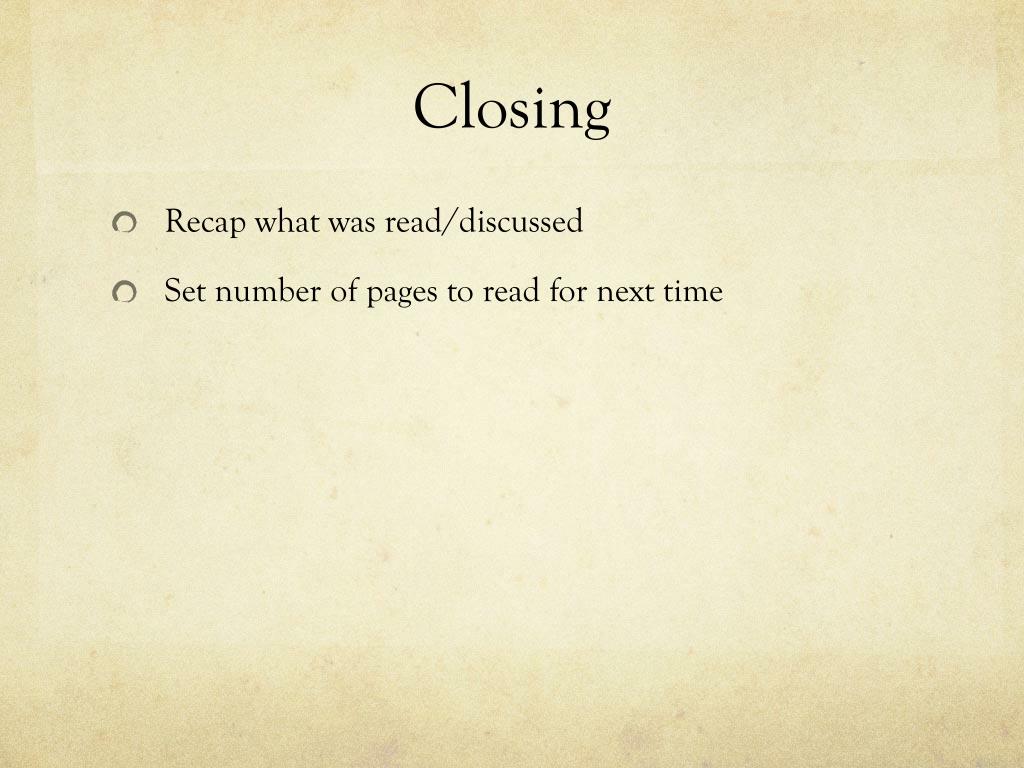 Closing • Recap what was read/discussed • Set number of pages to read for next time