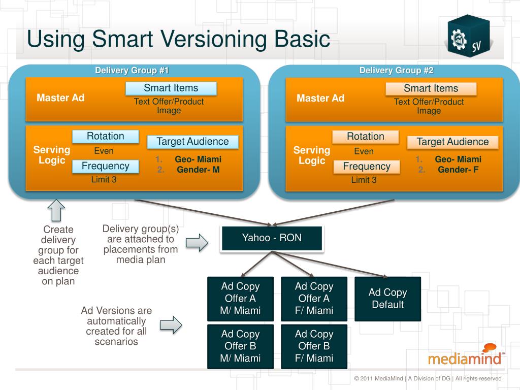 Using Smart Versioning Basic Delivery Group #1 Delivery Group #2 Smart Items Smart Items Master Ad Master Ad Text Offer/Product Image Text Offer/Product Image Rotation Rotation Target Audience Target Audience Serving Logic Serving Logic Even Even Geo- Miami Gender- M Geo- Miami Gender- F Frequency Frequency Limit 3 Limit 3 Delivery group(s) are attached to placements from media plan Create delivery group for each target audience on plan Yahoo - RON Ad Copy Offer A M/ Miami Ad Copy Offer A F/ Miami Ad Copy Default Ad Versions are automatically created for all scenarios Ad Copy Offer B M/ Miami Ad Copy Offer B F/ Miami