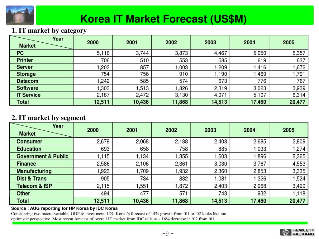 Korea IT Market Forecast (US$M) 1. IT market by category 2. IT market by segment Source : AUG reporting for HP Korea by IDC Korea Considering two macro-variable, GDP & investment, IDC Korea’s forecast of 14% growth from ‘01 to ‘02 looks like too optimistic perspective. Most recent forecast of overall IT market from IDC tells us - 16% decrease in ‘02 from ‘01.