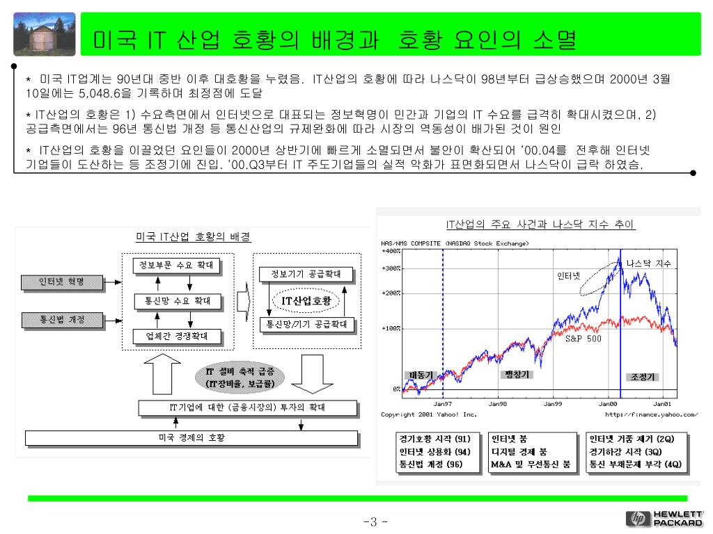 미국 IT 산업 호황의 배경과 호황 요인의 소멸 * 미국 IT업계는 90년대 중반 이후 대호황을 누렸음. IT산업의 호황에 따라 나스닥이 98년부터 급상승했으며 2000년 3월 10일에는 5,048.6을 기록하며 최정점에 도달 * IT산업의 호황은 1) 수요측면에서 인터넷으로 대표되는 정보혁명이 민간과 기업의 IT 수요를 급격히 확대시켰으며, 2) 공급측면에서는 96년 통신법 개정 등 통신산업의 규제완화에 따라 시장의 역동성이 배가된 것이 원인 * IT산업의 호황을 이끌었던 요인들이 2000년 상반기에 빠르게 소멸되면서 불안이 확산되어 ‘00.04를 전후해 인터넷 기업들이 도산하는 등 조정기에 진입. ‘00.Q3부터 IT 주도기업들의 실적 악화가 표면화되면서 나스닥이 급락 하였슴.