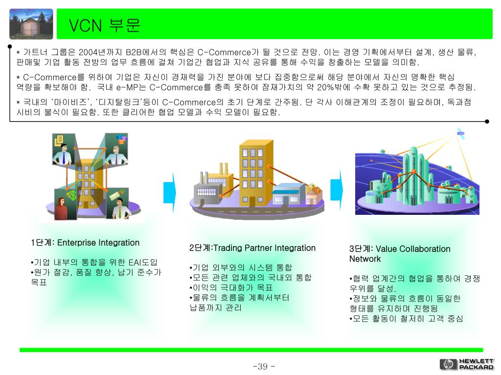 VCN 부문 * 가트너 그룹은 2004년까지 B2B에서의 핵심은 C-Commerce가 될 것으로 전망. 이는 경영 기획에서부터 설계, 생산 물류, 판매및 기업 활동 전방의 업무 흐름에 걸쳐 기업간 협업과 지식 공유를 통해 수익을 창출하는 모델을 의미함. * C-Commerce를 위하여 기업은 자신이 경재력을 가진 분야에 보다 집중함으로써 해당 분야에서 자신의 명확한 핵심 역량을 확보해야 함. 국내 e-MP는 C-Commerce를 충족 못하여 잠재가치의 약 20%밖에 수확 못하고 있는 것으로 추정됨. * 국내의 ‘마이비즈’, ‘디지탈링크’등이 C-Commerce의 초기 단계로 간주됨. 단 각사 이해관계의 조정이 필요하며, 독과점 시비의 불식이 필요함. 또한 클리어한 협업 모델과 수익 모델이 필요함. • 1단계: Enterprise Integration • 기업 내부의 통합을 위한 EAI도입 • 원가 절감, 품질 향상, 납기 준수가 목표 • 2단계:Trading Partner Integration • 기업 외부와의 시스템 통합 • 모든 관련 업체와의 국내외 통합 • 이익의 극대화가 목표 • 물류의 흐름을 계획서부터 납품까지 관리 • 3단계: Value Collaboration Network • 협력 업계간의 협업을 통하여 경쟁 우위를 달성. • 정보와 물류의 흐름이 동일한 형태를 유지하며 진행됨 • 모든 활동이 철저히 고객 중심