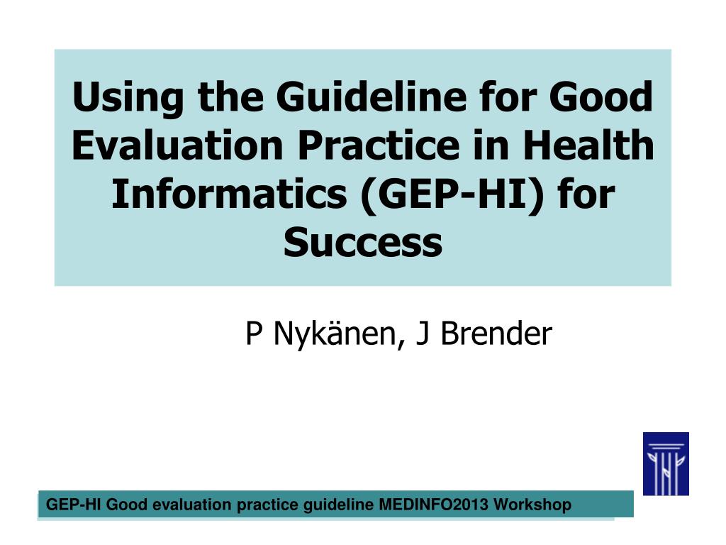 Using the Guideline for Good Evaluation Practice in Health Informatics (GEP-HI) for Success P Nykänen, J Brender GEP-HI Goodevaluationpracticeguideline MEDINFO2013 Workshop