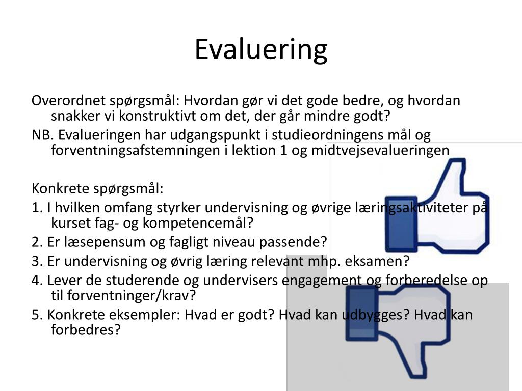 Evaluering Overordnet spørgsmål: Hvordan gør vi det gode bedre, og hvordan snakker vi konstruktivt om det, der går mindre godt? NB. Evalueringen har udgangspunkt i studieordningens mål og forventningsafstemningen i lektion 1 og midtvejsevalueringen Konkrete spørgsmål: 1. I hvilken omfang styrker undervisning og øvrige læringsaktiviteter på kurset fag- og kompetencemål? 2. Er læsepensum og fagligt niveau passende? 3. Er undervisning og øvrig læring relevant mhp. eksamen? 4. Lever de studerende og undervisers engagement og forberedelse op til forventninger/krav? 5. Konkrete eksempler: Hvad er godt? Hvad kan udbygges? Hvad kan forbedres?